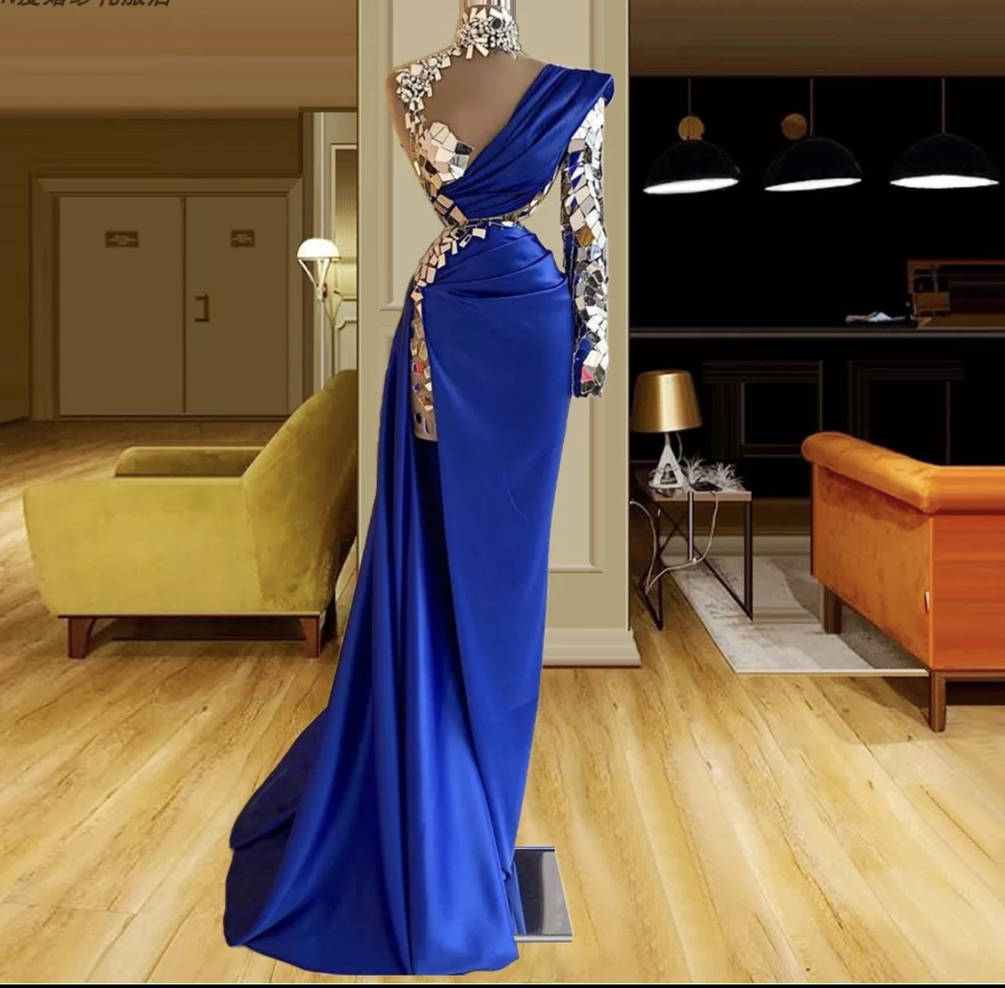 Jaw dropping royal blue gown with metallic graphic accent trim. Size: large.